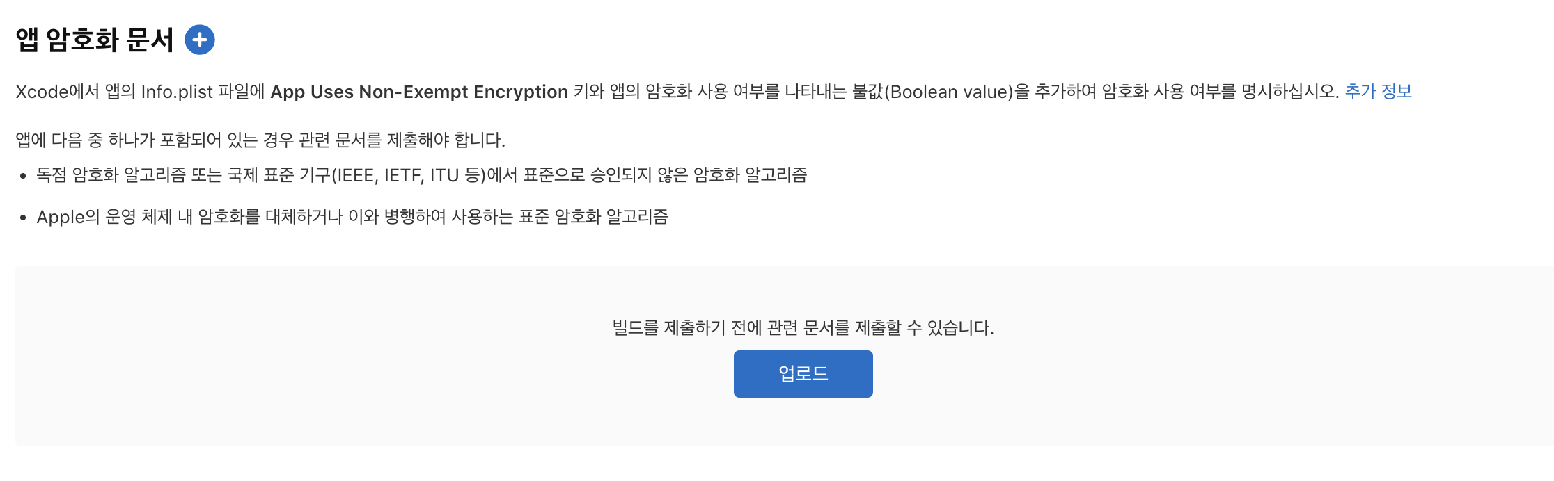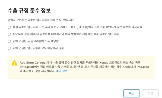 빌드를 올리면 경고 표시가 뜨면서 수출 규정 준수 정보를 입력하라는 표시가 뜹니다