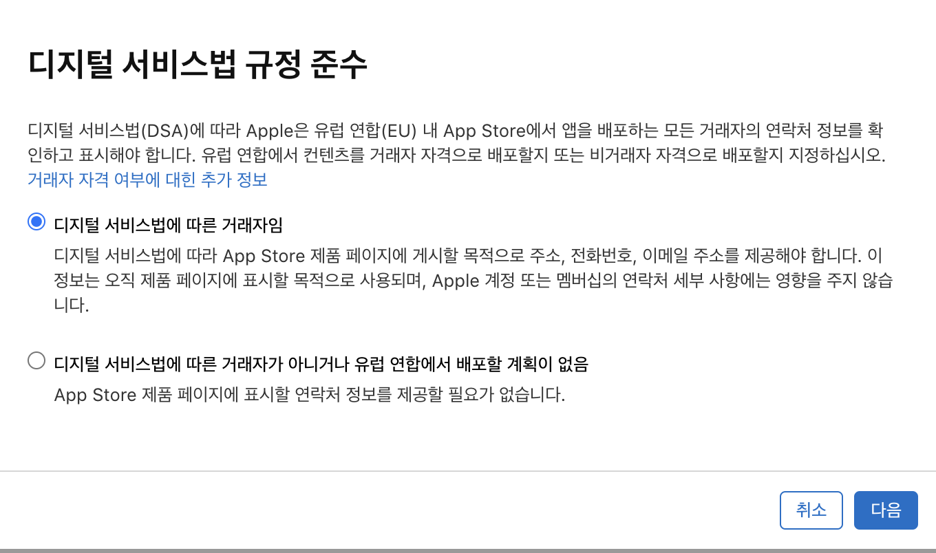 디지털 서비스법에 따른 거래자를임을 선택하고 다음을 누르면